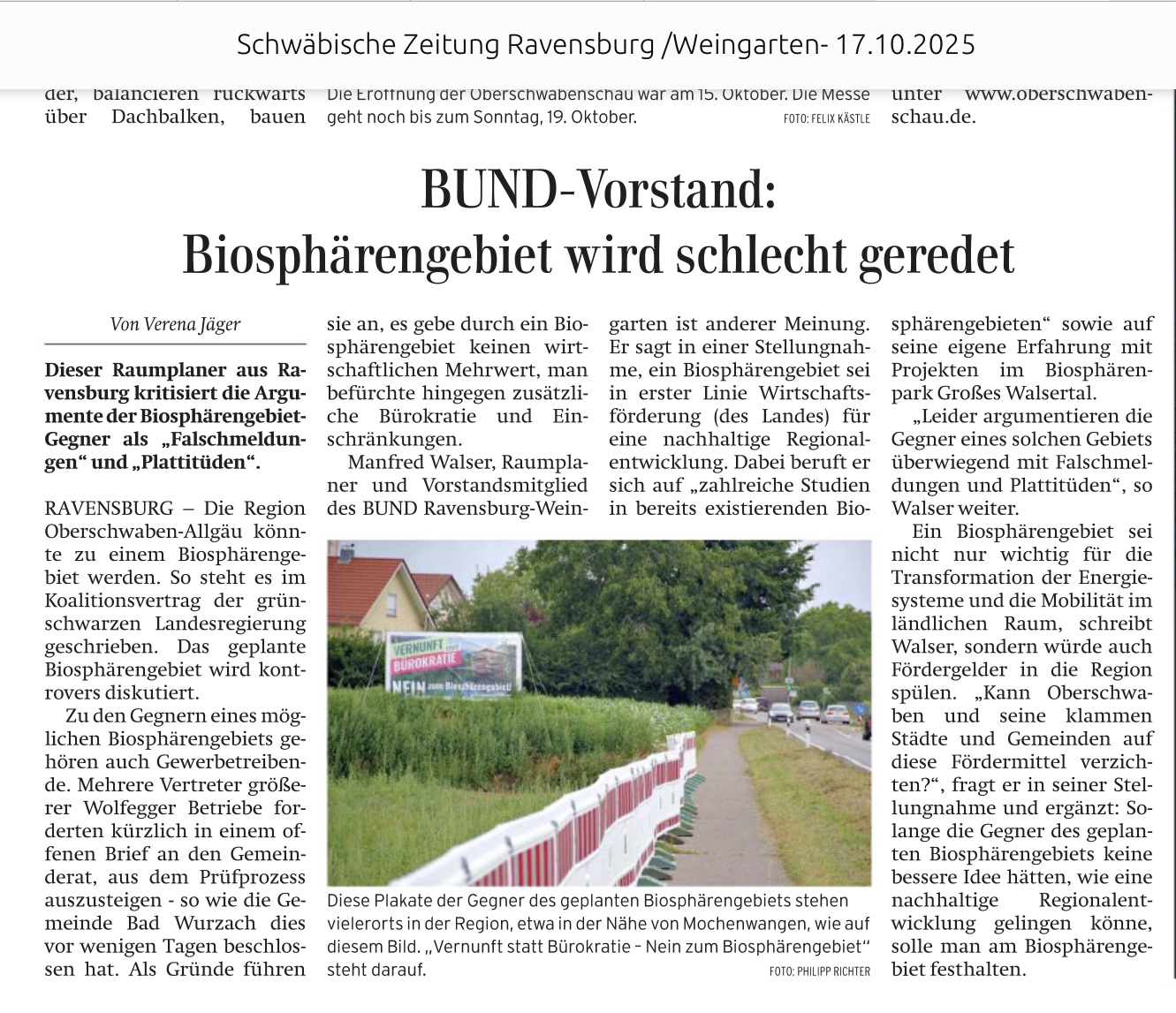 | PRO BIOSPHÄRE e.V. – AKTUELL Herzliche Einladung ! Infoveranstaltung zum geplanten Biosphärengebiet am 5. November 2025 von 18.30 bis ca. 20:30 in der Stadthalle Bad Waldsee u.a. mit Landrat a.D. Thomas Reumann, Bürgermeister Mike Münzing aus Münsingen, Christian Bauer, Vorsitzender der Geschäftsführung der Hymer GmbH und Co. KG, Dieter Giehmann von der Bürgerakademie Donau Oberschwaben und Gottfried Härle von den Biosphärenbotschaftern. Moderation: Eva-Maria Armbruster | Pro Biosphäre e.V. lädt zur Infoveranstaltung zum geplanten Biosphärengebiet Oberschwaben Am 5. November 2025 von 18:30 bis ca. 20:30 Uhr lädt Pro Biosphäre e.V. zur Infoveranstaltung zum geplanten Biosphärengebiet Oberschwaben in die Stadthalle Bad Waldsee ein. Die Veranstaltung bietet den Bürgerinnen und Bürgern der Region eine Gelegenheit, sich umfassend über das geplante Biosphärengebiet zu informieren und an der Diskussion teilzunehmen. Mit dabei sind Landrat a.D. Thomas Reumann, Bürgermeister Mike Münzing aus Münsingen, Christian Bauer, Vorsitzender der Geschäftsführung der Hymer GmbH und Co. KG, Dieter Giehmann von der Bürgerakademie Donau Oberschwaben und Gottfried Härle von den Biosphärenbotschaftern. Die Veranstaltung wird von Eva-Maria Armbruster moderiert. Im Mittelpunkt der Veranstaltung steht die Bürgerbeteiligung, um eine fundierte und transparente Entscheidung für die Region zu ermöglichen. Das geplante Biosphärengebiet Oberschwaben soll eine nachhaltige Entwicklung fördern und der Region neue Chancen bieten – sowohl für die Landwirtschaft als auch für den Tourismus und die Wirtschaft. Die Veranstaltung richtet sich an alle Interessierten, die Fragen und Bedenken zur Zukunft der Region einbringen und konkrete Ideen für die Weiterentwicklung der Biosphäre diskutieren möchten. |